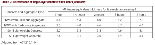 The data in Table 1 demonstrate that lightweight concrete is more effective in resisting the effects of fire exposure than conventional normal weight concrete because the thickness of lightweight concrete required to achieve the same fire resistance rating is less than for conventional concrete. Another way of looking at the data provided in Table 1 is to recognize that lightweight concrete will provide increased fire protection compared to an equal thickness of conventional concrete. From the values in the table, it appears that lightweight concrete provides a roughly 50% increase in fire resistance rating compared to the same thickness of conventional concrete.