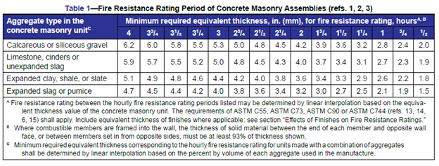 National Concrete Masonry Association (NCMA), TEK 07-01D, “Fire Resistance Ratings of Concrete Masonry Assemblies”, 2018.